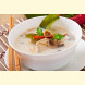 En cremet suppe med kokosmælk toppet med løg, koriander, friske tomater, champignon og forårsløg.